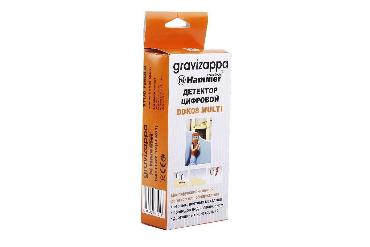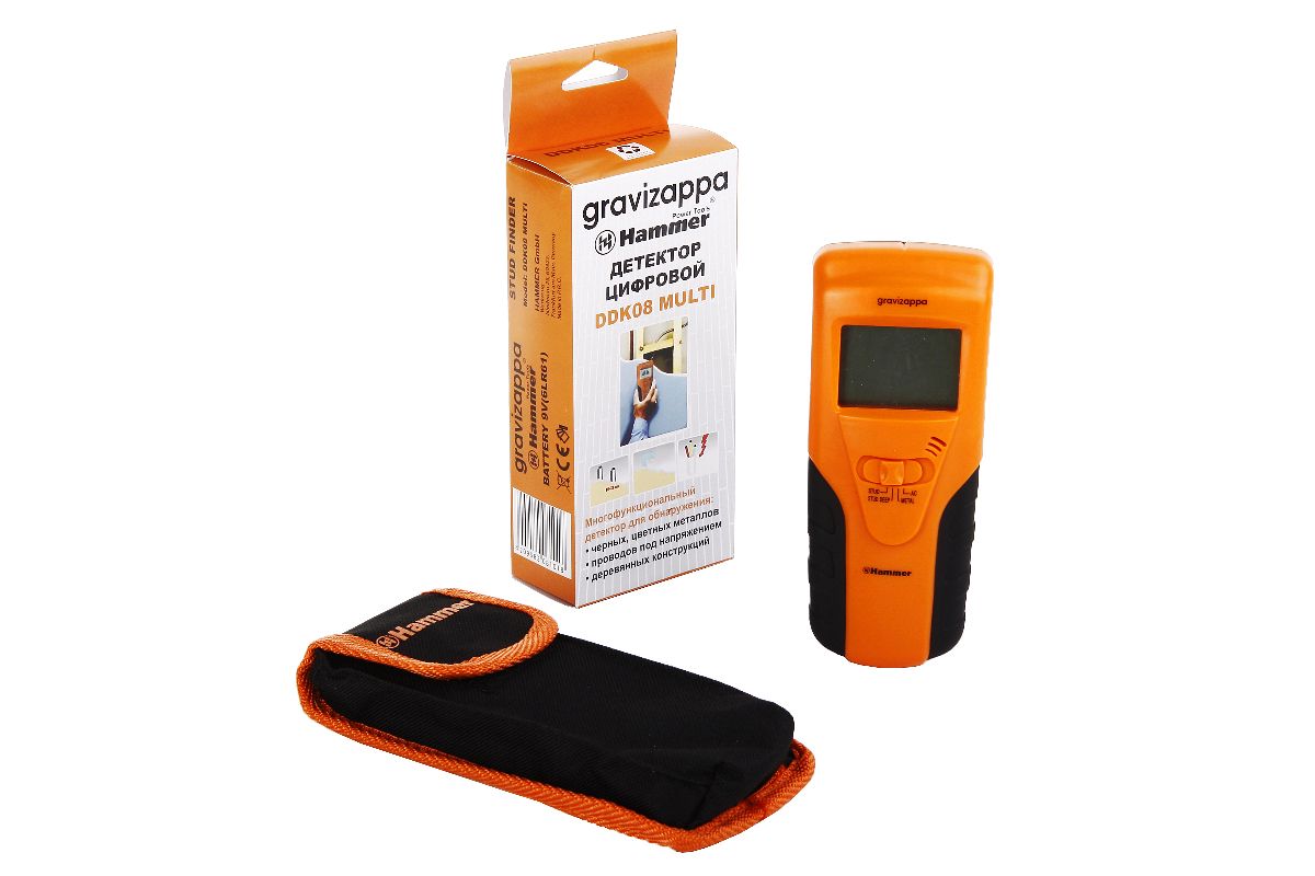 GRAVIZAPPA DDK 08 MULTI — бытовой цифровой детектор с несколькими режимами и глубиной сканирования до 30 мм. Определяет наличие в стене древесины, металлов (цветных и черных), проводки под напряжением. Для удобства предусмотрена двойная сигнализация — на экране и звуковая. Поставляется прибор в защитном чехле.