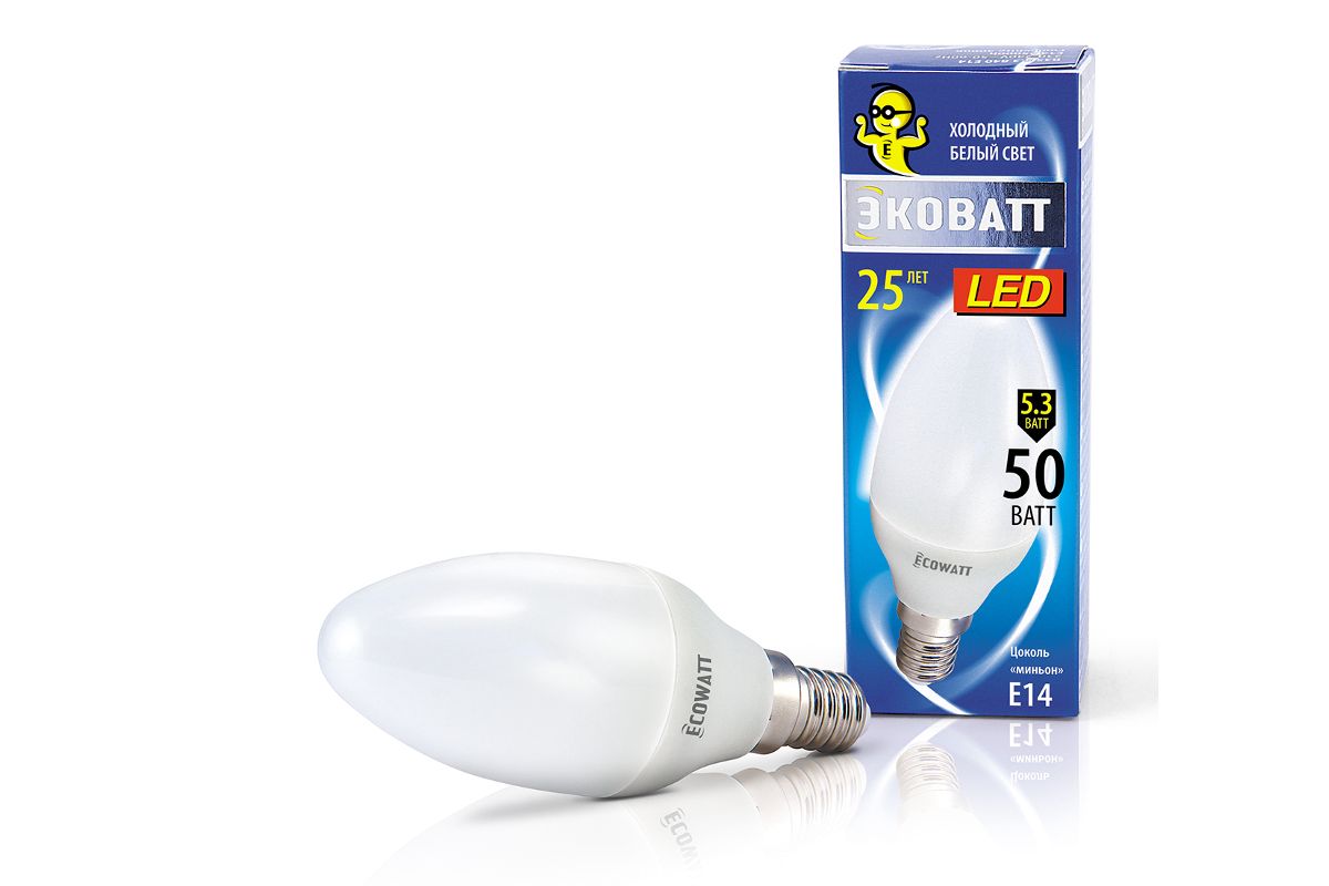 Светодиодная лампа холодный белый свет, свеча имеет вытянутую форму колбы, идеальна для совместного использования с осветительными приборами, имеющими открытую форму плафона.