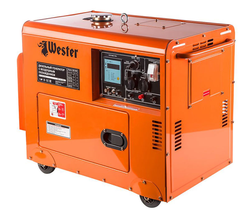 WESTER GND4800D – дизельный генератор для использования на предприятии, стройке или в загородном доме. Полная мощность – 4800 ВА. Рабочий объём двигателя – 406 см³. Подойдёт для полного и постоянного электрообеспечения дачного участка.