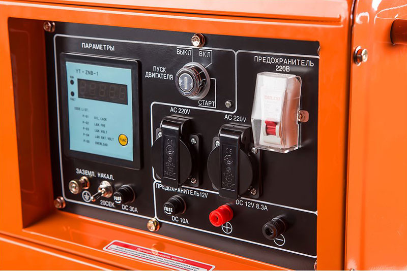 - Все данные о работе выводятся на цифровой экран: текущее напряжение и выходной ток розеток и аккумуляторных клемм, частота напряжения и наработка двигателя.
