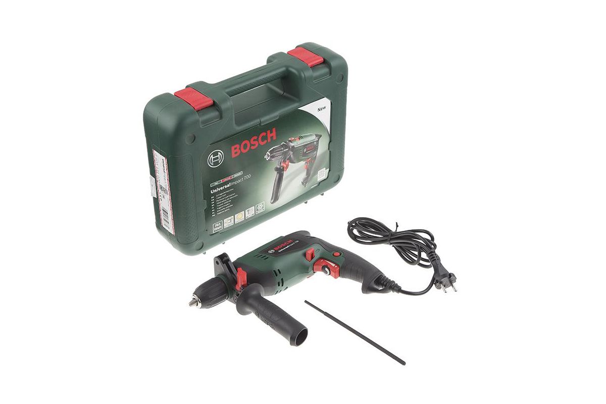 Ударная дрель Bosch UniversalImpact 700 0.603.131.020 оснащена переключателем функций ''заворачивание/сверление/сверление с ударом''. Система Bosch Speed-Preselection позволяет регулировать частоту вращения с помощью колесика и кнопочного выключателя, настраиваясь на работу с конкретным типом материала. Благодаря быстрозажимному патрону с опцией Press&Lock блокировка шпинделя осуществляется одним нажатием кнопки - это позволит быстро заменить оснастку. Для комфортного захвата инструмента без проскальзывания предусмотрены мягкие накладки Soft-Grip.