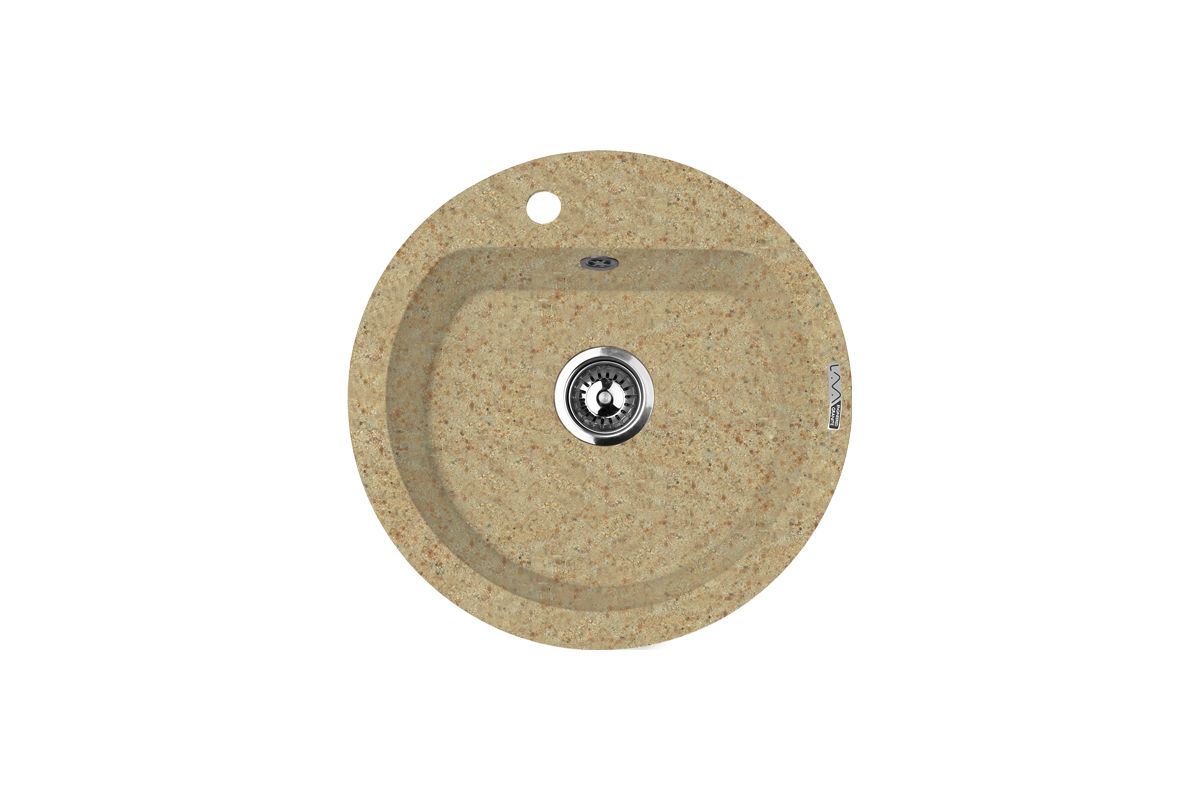 Круглая мойка с самой большой по диаметру чашей 42,5 см.и самой глубокой 21 см. Ширина установочной тумбы не менее 50 см. Вырез под мойку диаметр 47,5 см. Установка сверху. Одно сквозное отверстие и одно намеченное. Сливная арматрураи сифон в комплекте.