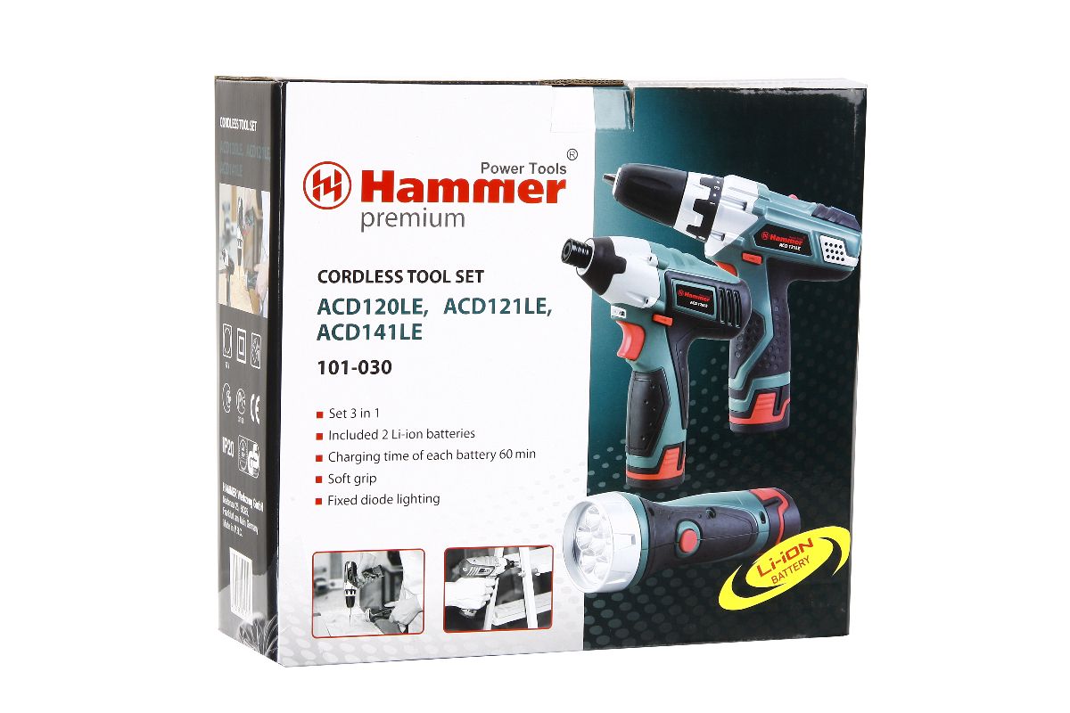 В комплект HAMMER PREMIUM входит: дрель-шуруповерт ACD121LE, ударный гайковерт ACD120LE и фонарь ACD141LE, 2 Li-ION аккумулятора и быстрозарядное устройство. Оптимальный набор для решения любых бытовых задач: от небольшого ремонта до сборки мебели. Для компактного хранения и удобства при переноске все инструменты сложены в прочную сумку.