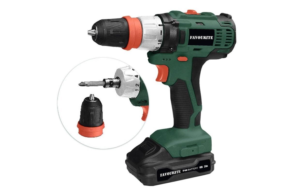 Аккумуляторная дрель-шуруповерт ''FAVOURITE'' снабжена быстрозажимным, сьемным патроном, благодаря чему смена оснастки не занимает много времени.