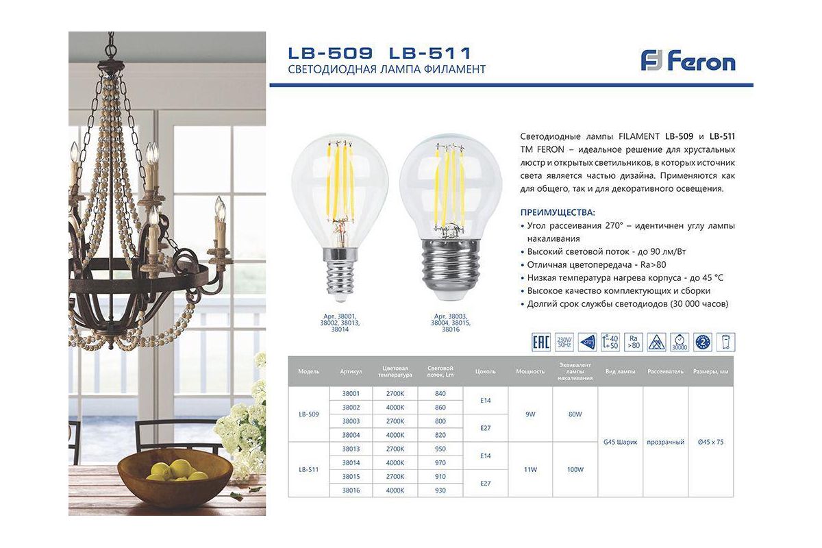 Лампа светодиодная филамент FERON LB-509, G45 (шар малый), 9W 230V E27 2700К (белый теплый), рассеиватель прозрачный 840Lm, угол рассеивания 270°, 75*45мм