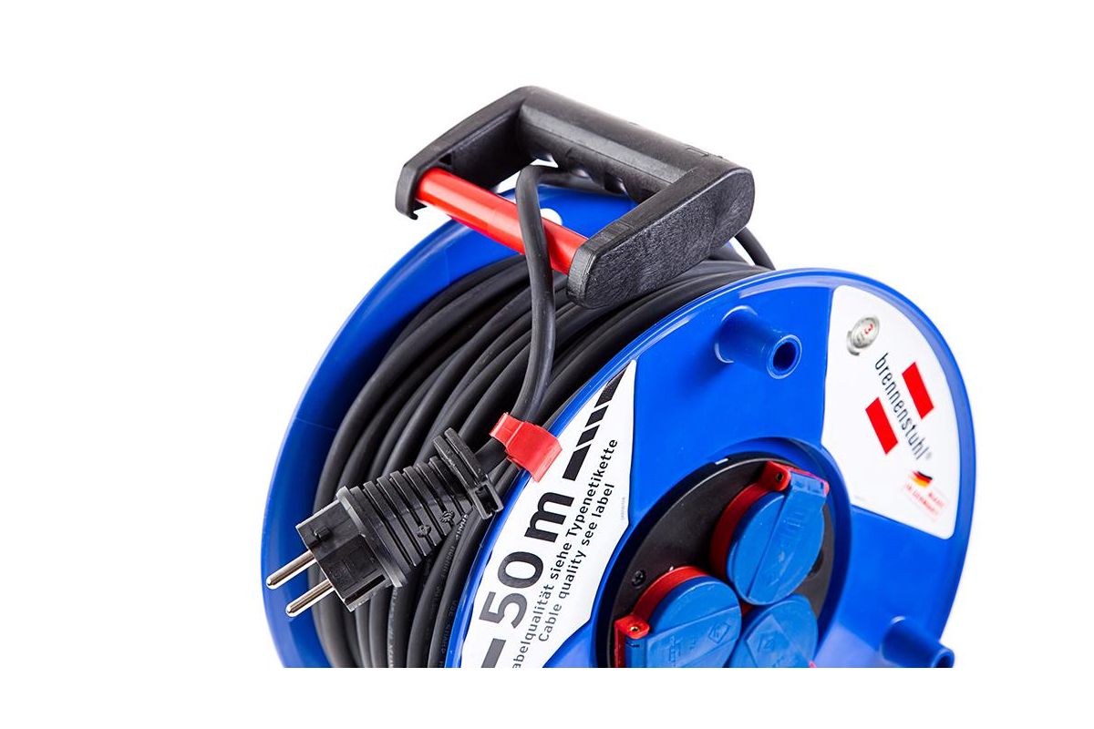 Удлинитель промышленный BRENNENSTUHL на катушке оснащен 3 влагозащищенными розетками с самозакрывающимися защитными колпачками и защитным датчиком от перегрева и перегрузки.