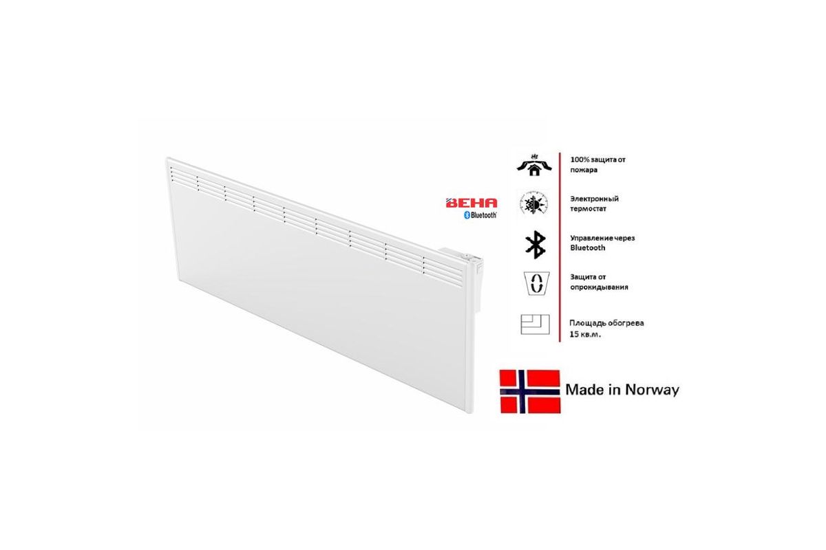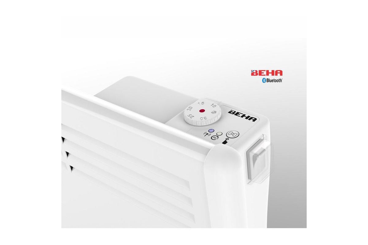 Конвектор обогреет помещение площадью до 15 м.кв. Он оснащён встроенной системой управления (Bluetooth), которая позволяет изменять работу прибора локально, с мобильных устройств. Конвектор укомплектован кабелем (1,5м.) со штепсельной вилкой. Модель имеет ударопрочные боковые поверхности корпуса. Для установки с помощью кронштейна необходимо разметить на стене четыре отверстия, вкрутить в них шурупы и установить обогреватель в стационарное положение. Модель оснащена высокоточным электронным термостатом. Благодаря использованию встроенного модуля Bluetooth, существует несколько вариантов экономии электроэнергии, за счет самостоятельной настройки температурного режима и выбора времени работы конвектора, через приложение - BEHA Bluetooth Heater.